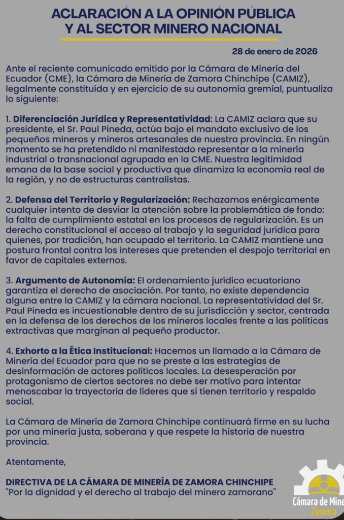 La CAMIZ puntualizó que su presidente, el Sr. Paul Pineda, actúa bajo el mandato único de los pequeños mineros y mineros artesanales de la provincia. En el comunicado, se enfatiza que la institución no pretende representar a la minería industrial o transnacional agrupada en la CME, cuya base social y productiva difiere de la realidad productiva local zamorana.