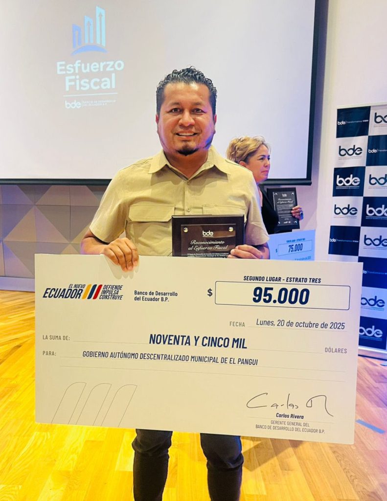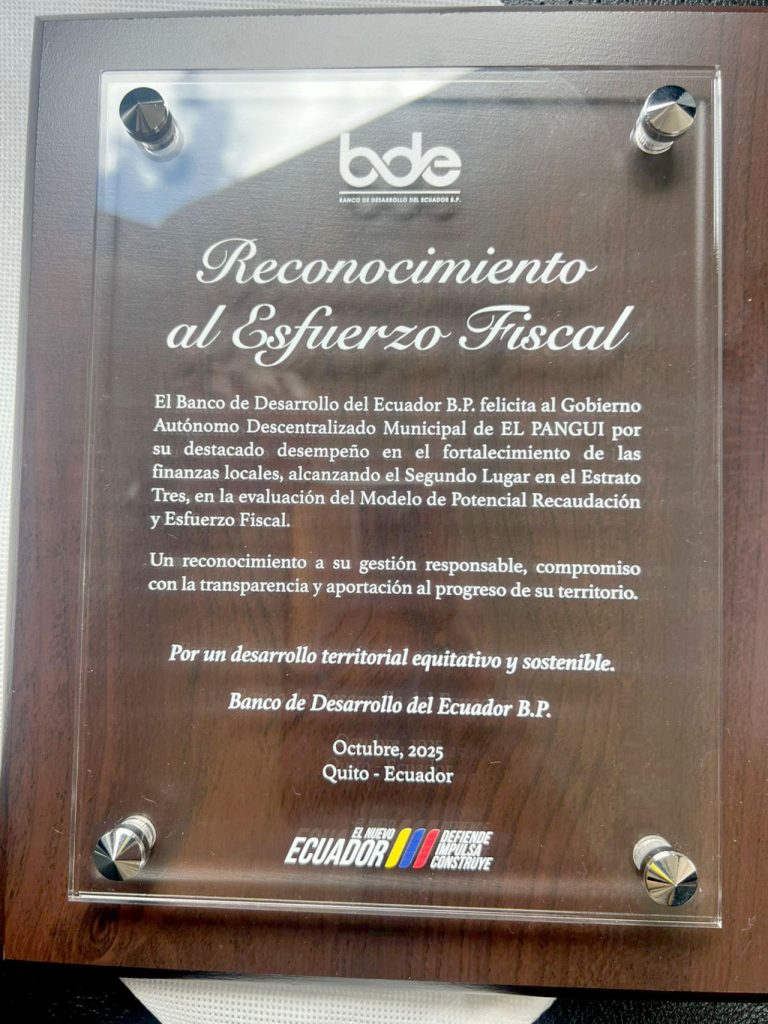 El Banco de Desarrollo del Ecuador (BDE) otorgó un reconocimiento al GAD Municipal del cantón El Pangui, provincia de Zamora Chinchipe, por su destacado desempeño en el fortalecimiento de las finanzas locales.