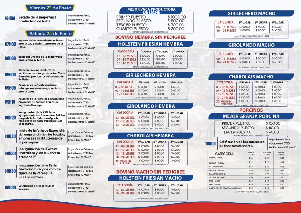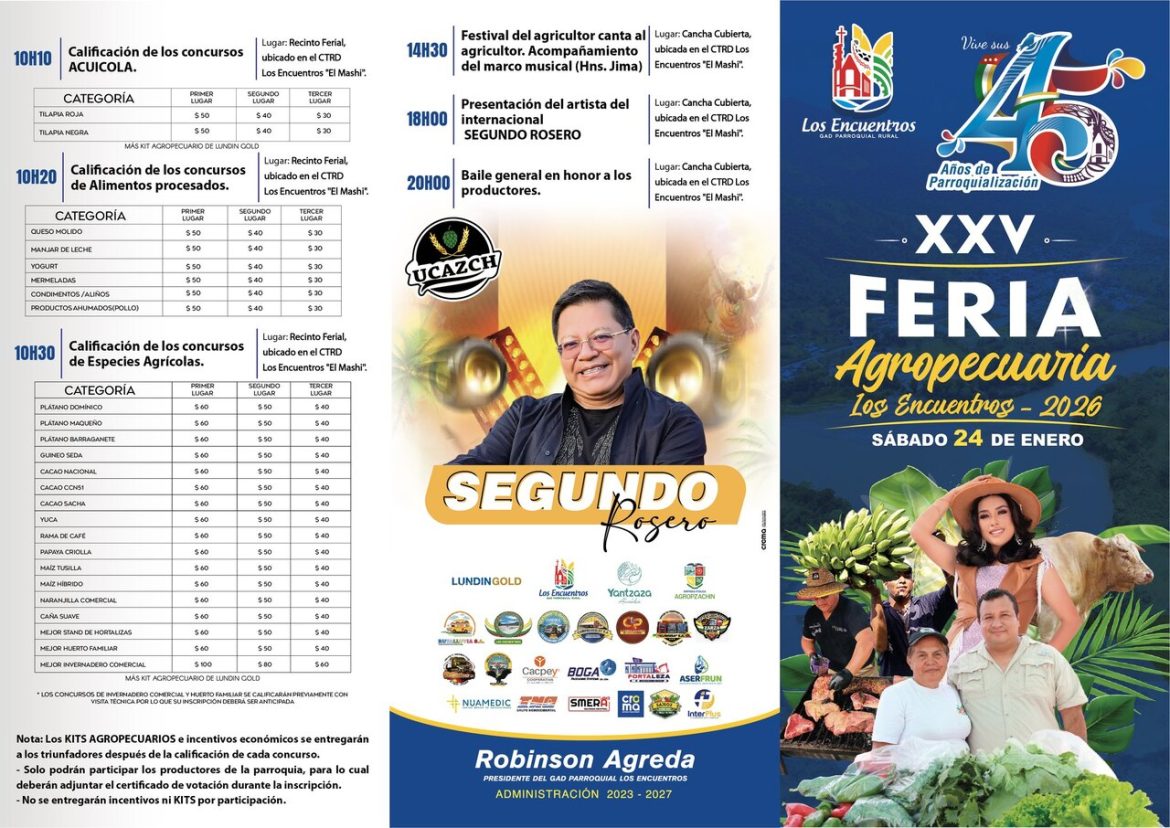 La parroquia de Los Encuentros, conocida por su vitalidad productiva, celebrará este sábado 24 de enero la edición número 25 de su emblemática Feria Agropecuaria. El evento, organizado por el GAD Parroquial, busca consolidarse una vez más como la vitrina más importante para el sector agroproductivo del cantón Yantzaza.