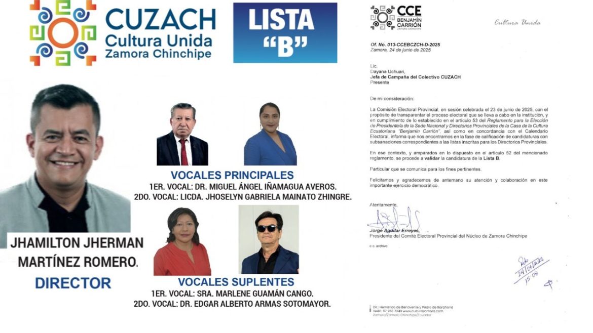 El colectivo “CUZACH” Cultura Unida Zamora Chinchipe, Lista B, liderado por Jhamilton Martínez, ha logrado la validación de su candidatura. Esta confirmación por parte de la Comisión Electoral de la Casa de la Cultura de Zamora Chinchipe asegura su participación en las elecciones para el período 2025-2029, en conformidad con los reglamentos establecidos.
