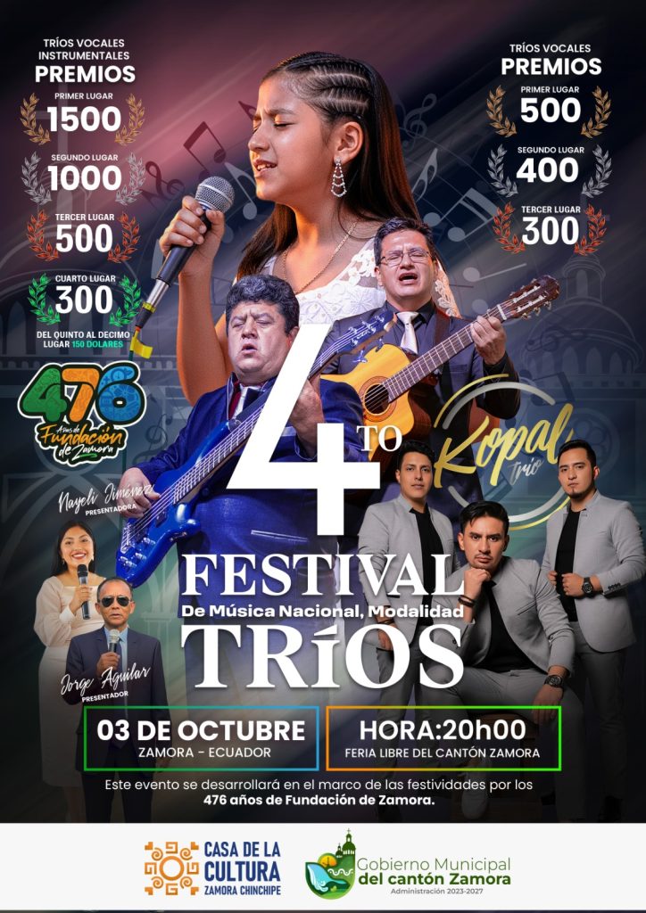 La ciudad de Zamora se prepara para vivir una noche llena de música y tradición con la realización del 4to Festival de Música Nacional en la modalidad de Tríos, que se llevará a cabo el próximo 3 de octubre a las 20h00 en la Feria Libre del cantón Zamora.